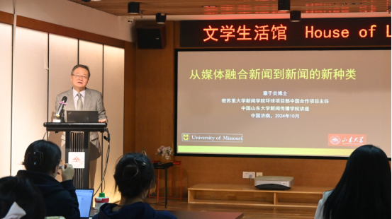 章于炎详细梳理和讲解了融合新闻发展的趋势及其新类别。他深入探讨了当今媒体环境中融合新闻的演变,分析了其在技术和内容上的创新,如多媒体报道和互动式新闻。同时,他还介绍了密苏里大学新闻学院在媒体融合专业方面的教育体系,分享了该专业卓越的教学成果,包括师生们的精彩作品。通过生动的案例分析和实际作品展示,不仅让在场的师生了解了融合新闻的前沿动态,也激励他们积极参与这一充满活力和潜力的领域。