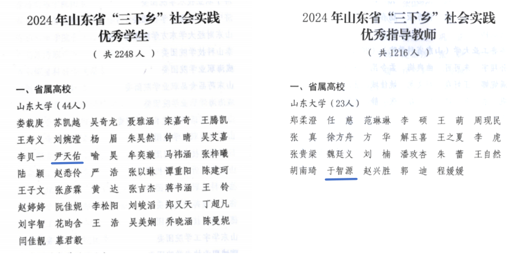 近日,山东省下发关于2024年“调研山东”——2024年山东省大中专学生志愿者暑期“三下乡”社会实践活动评奖结果的通报,我院学生尹天佑与指导教师于智源副教授分别获评2024年山东省“三下乡”社会实践优秀学生、2024年山东省“三下乡”社会实践优秀指导教师。