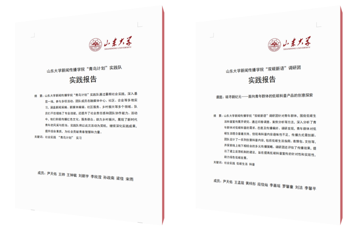 于智源指导了多支“三下乡”暑期社会实践团队,其中“双碳新语”调研团和“青鸟计划”实践队均入选山东大学2024年社会实践优秀团队。于智源在指导山东大学“双碳新语”社会实践团队过程中,精心组织团队成员认真学习习近平生态文明思想,指导团队成员进行社会调研和产品开发,并指导了社会实践调研报告的构思与写作。在指导“青鸟计划”实践队时,于智源从新闻学科专业实习特点出发,强调“重数据”“用作品说话”,为社会实践成果的总结与交流提出具体意见。