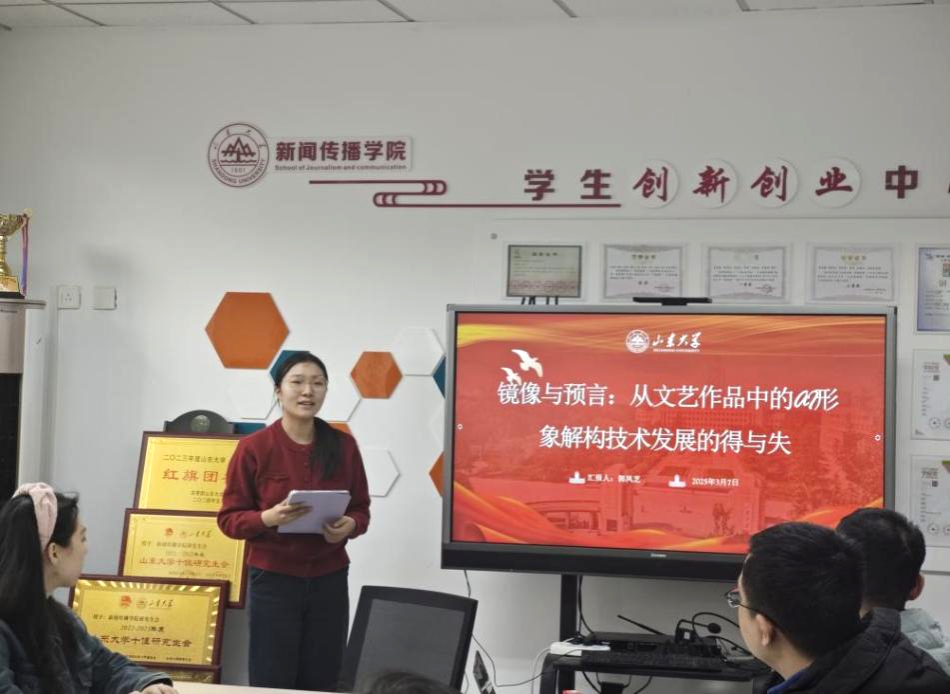 之后,郭凤芝同志以“镜像与预言:从文艺作品中的形象解构技术发展的得与失”为主题进行分享。郭凤芝同志从文艺作品入手,强调技术赋能带来了效率提高与认知突破,但在算法社会中,如果越来越依赖AI填补空虚,则会产生伦理失序与主体性消解等问题,提醒大家要立足跨学科视野,提高技术素养,坚守新闻伦理。