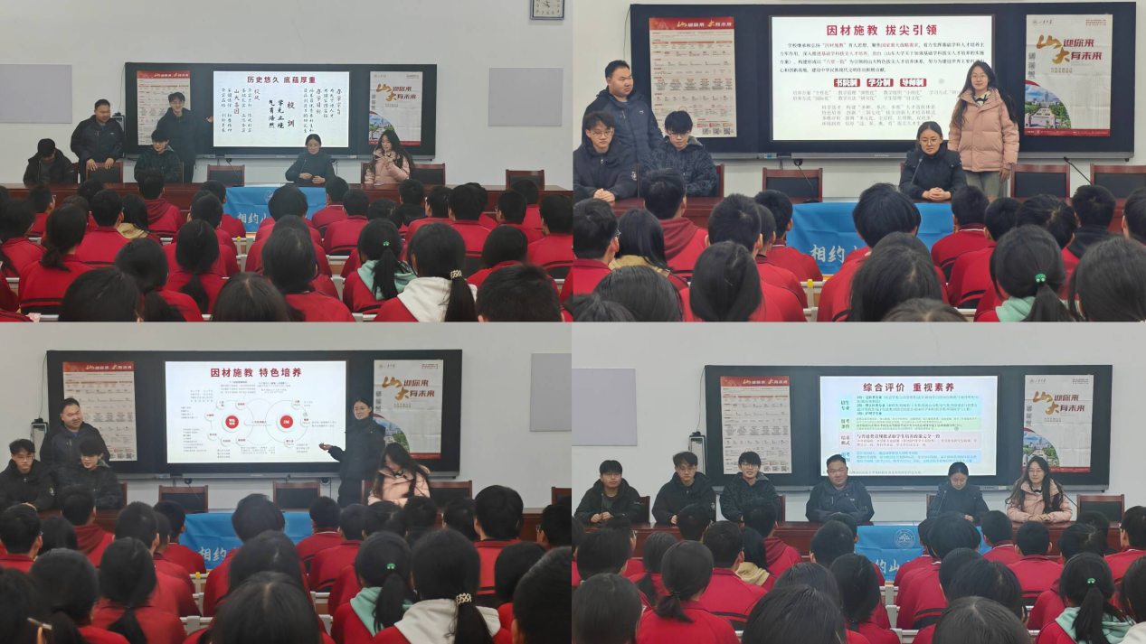 宣讲团高度重视回访宣讲工作,前期召开了预备会议,发布了预告推文,认真打磨宣讲内容,并结合宣讲内容重新制作了演示文稿。在正式宣讲之前,团队对宣讲流程进行了预演,确保了宣讲的顺利进行。此次宣讲活动让学弟学妹们对于山东大学和大学生活有了更多的认知,激励了广大学生。接下来,团队将继续落实后续回访和答疑工作,助力更多的学弟学妹圆梦山大。