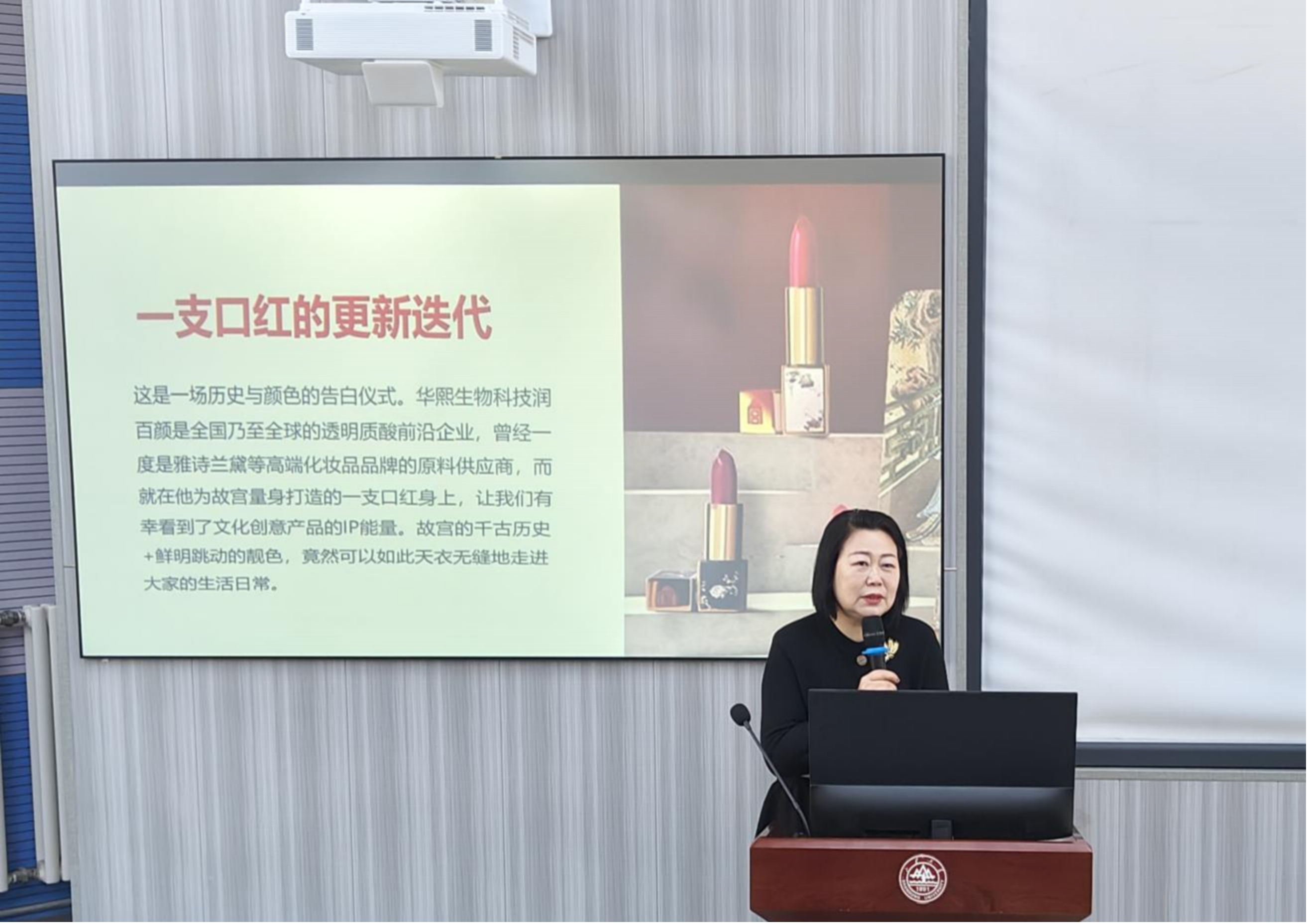 课程伊始,孙美华以“创意是什么”引出今日的分享话题。她指出,创意不仅表现在产品形态方面,还表现在行业类型和思维模式领域。通过几个近年来爆火的创意案例,孙美华向同学们展开讲述创意在文创产业中的多元呈现:华熙生物科技结合市场所需与集团优势,将故宫历史与跳动靓色融合研制文创口红,为故宫IP创造更大流量;2022年春晚舞蹈节目《只此青绿》从《千里江山图》中深挖传统文化内涵,使千古名画再回大众视野;刀郎新歌《罗刹海市》另辟蹊径,借鉴经典《聊斋志异》精神内核,引发淄博蒲松龄故居爆红;“只有河南· 戏剧幻城”、音乐节奏游戏《尼山萨满》将民族文化与时代特色结合,创新打造沉浸式体验……