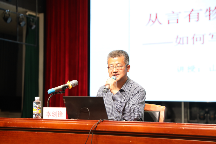 24日下午,招生拓展组受邀在海口中学举办“从言有物、言有序到言有味——如何写好作文和应对考场作文”专题讲座。本次讲座由海口中学副校长瞿朝辉主持、山东大学文学院教授李剑锋主讲,海口中学初高中各年级相关老师、前100名优秀学子共约600余人参加。讲座中,李剑锋从读书与写作、审美与生活等视角,给在场师生讲解了写好考场作文的“道”和“术”。