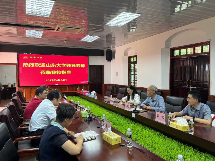 24日上午,招生拓展组走进海南中学,海南中学副校长贺航飞、教务科主任兼高三年级长唐盛彪、教务科副主任董新和高三年级班主任代表到场,共同参与研讨会。会上,结合山东大学在海南历年录取数据和考生报考特点,招生拓展组围绕学校招生政策、优势学科和正在招生中的强基计划等进行介绍。双方进一步聚焦师生联合开展夏令营活动、学科竞赛、红色研学等未来合作,展开深入研讨。