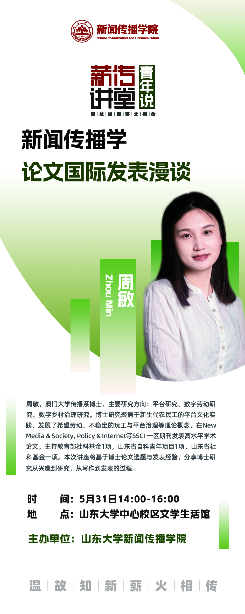 周敏,澳门大学传播系博士。主要研究方向:平台研究、数字劳动研究、数字乡村治理研究。博士研究聚焦于新生代农民工的平台文化实践,发展了希望劳动、不稳定的玩工与平台治理等理论概念,在New Media & Society, Policy & Internet等SSCI 一区期刊发表高水平学术论文。主持教育部社科基金1项,山东省自科青年项目1项,山东省社科基金1项。本次讲座将基于博士论文选题与发表经验,分享博士研究从兴趣到研究,从写作到发表的过程。